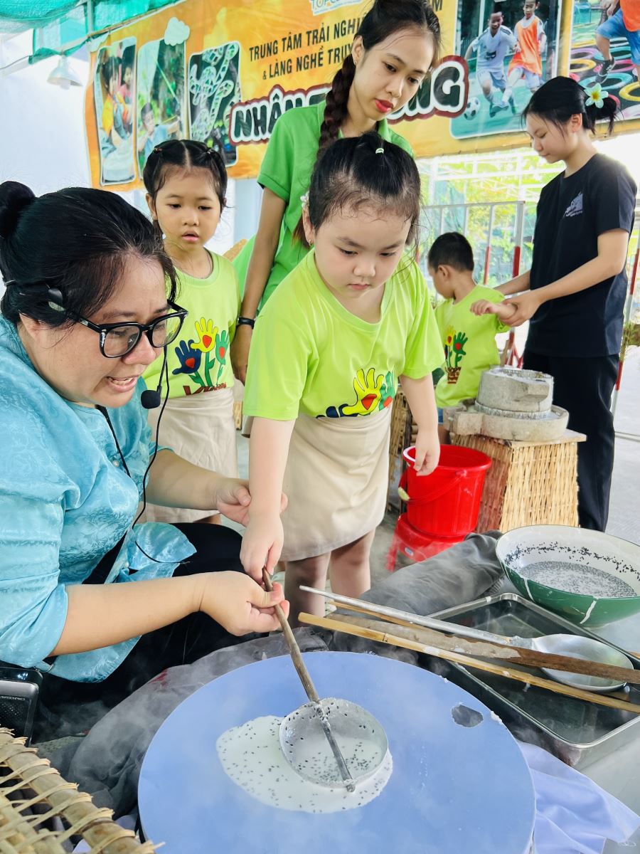 Hành trình đưa các em đến với bếp lò nghi ngút khói thơm. Học sinh sẽ trải nghiệm các công đoạn: xay bột, tráng bánh trên hơi nước và phơi bánh lên phên trê dưới nắng tự nhiên. Bài học về sự vất vả của người nông dân giúp các em nuôi dưỡng lòng biết ơn và sự trân trọng thực phẩm.